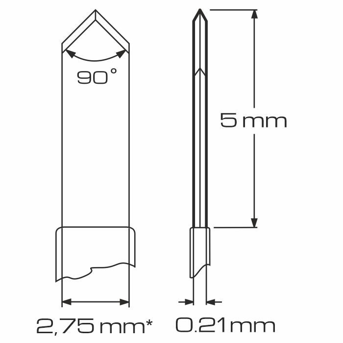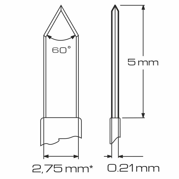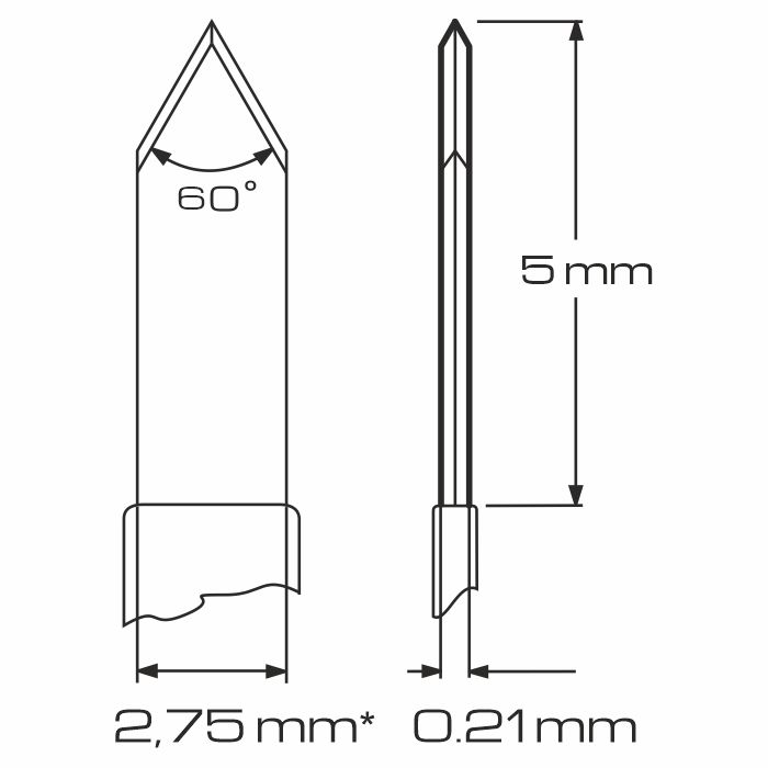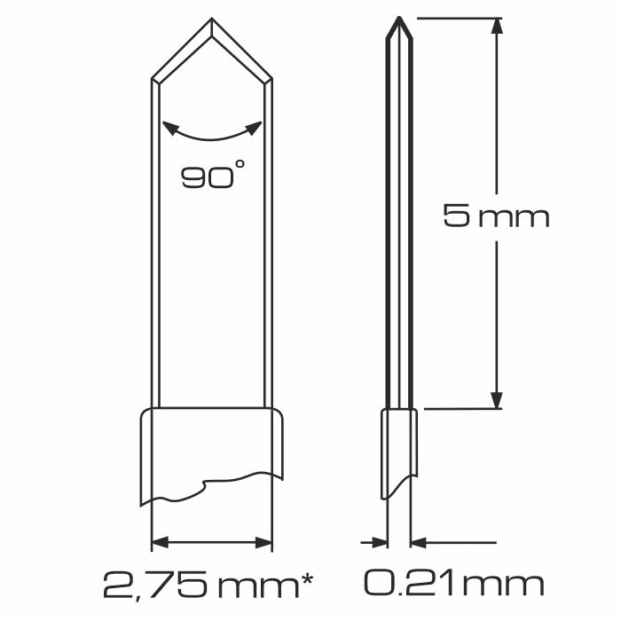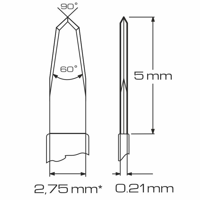 Double lancet with blunt sides Width: 2.75 mm* Thickness: 0.21 mm Length: 5.0 mm *Blade width from 0.8 to 3.5 mm |