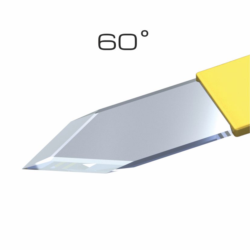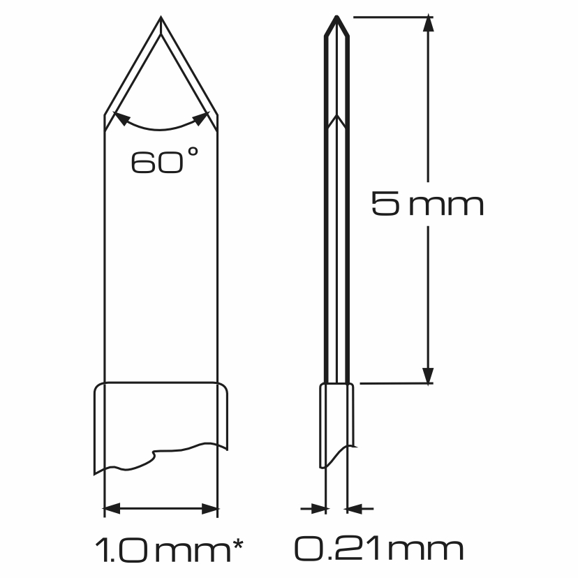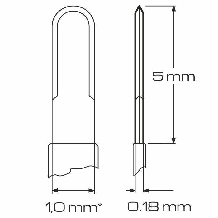 Double lancet with blunt sides Width: 1.0 mm* Thickness: 0.18 mm Length: 5.0 mm *Blade width from 1.0 to 3.0 mm |