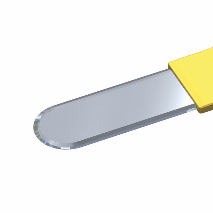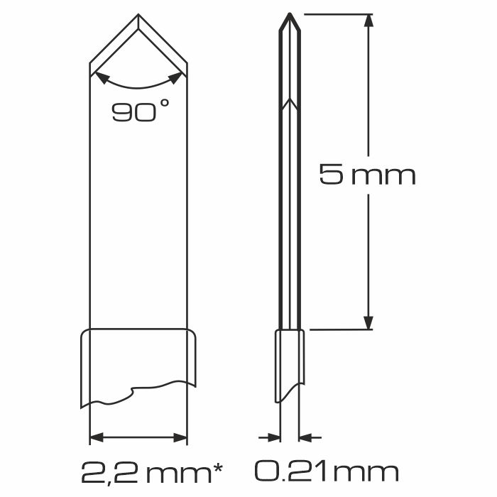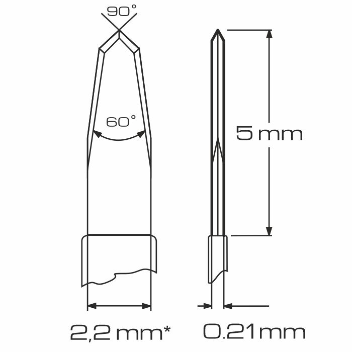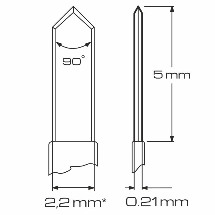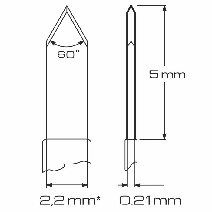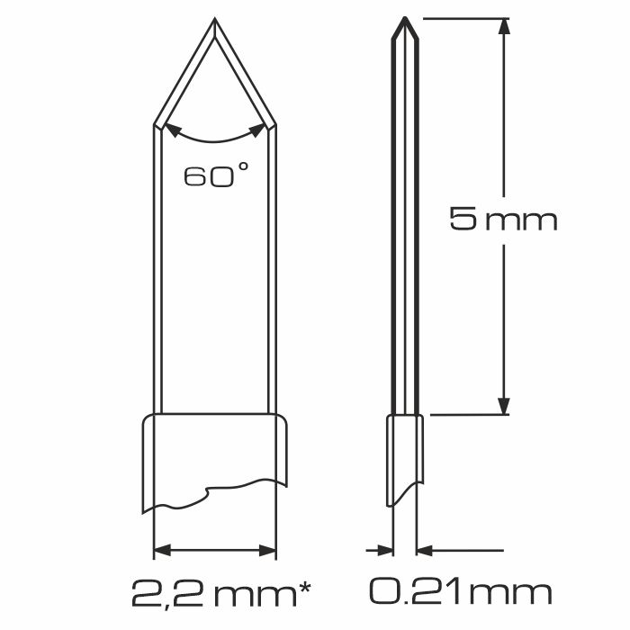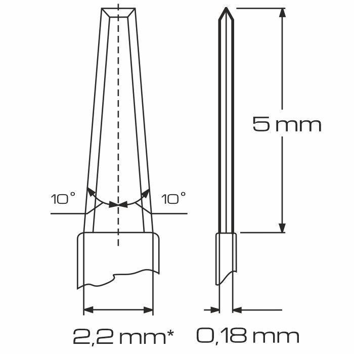 Double lancet with blunt sides Width: 2.2 mm* Thickness: 0.21 mm Length: 5.0 mm *Blade width from 0.8 to 3.5 mm |