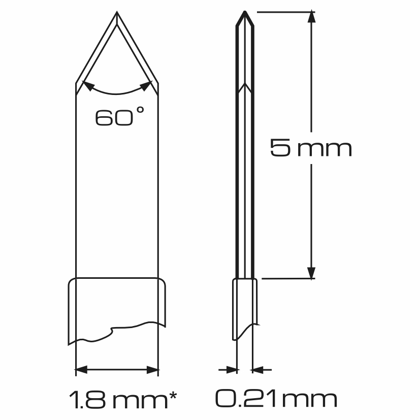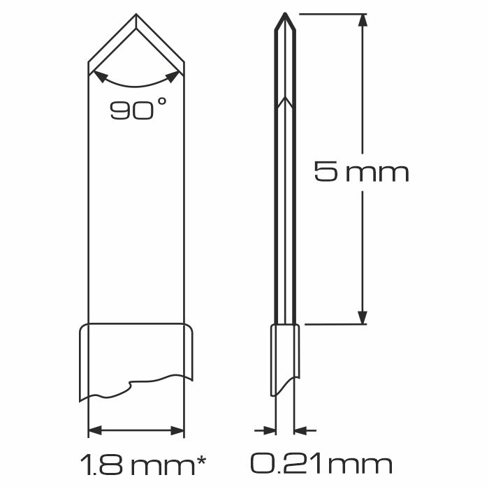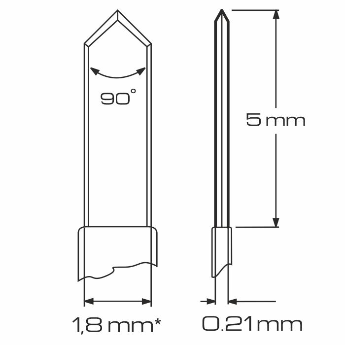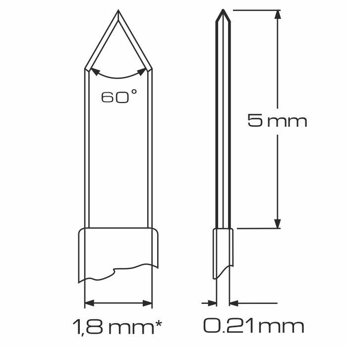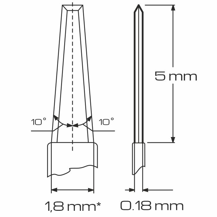 Double lancet with blunt sides Width: 1.8 mm* Thickness: 0.21 mm Length: 5.0 mm *Blade width from 0.8 to 3.5 mm |