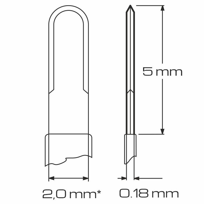 Double lancet with blunt sides Width: 2.0 mm* Thickness: 0.18 mm Length: 5.0 mm *Blade width from 1.0 to 3.0 mm |