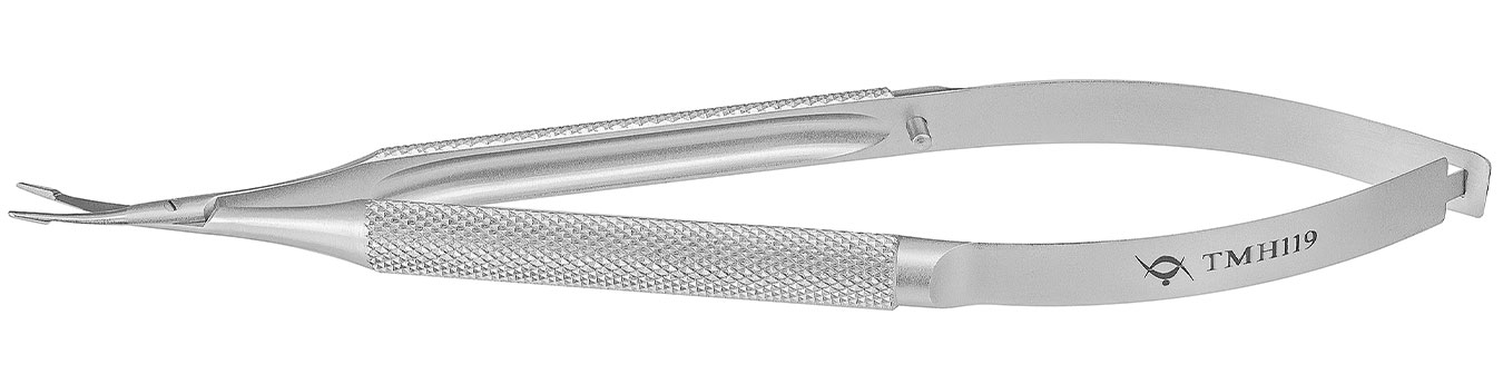 Jaws: fine, length 3.5 mm, 0.5 mm wide curved 7.5 mm scissors blades